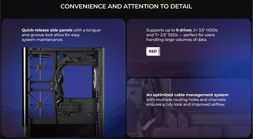 Black metal/tempered-glass midi-tower (vertical orientation) — supports Micro-ATX & Mini-ITX motherboards; includes 3 ARGB fans (2×120 mm top, 1×120 mm rear) and mesh side intake; supports liquid cooling (top: 120/140/240/280 mm, rear: 120 mm); front I/O with USB 2.0, USB 3.x, and audio on side panel; accommodates GPUs up to 340 mm, CPU coolers up to 160 mm; offers 7 × 2.5" and 2 × 3.5" drive bays, 4 expansion slots; dimensions 355 × 210 × 446 mm — sleek, compact & customizable.