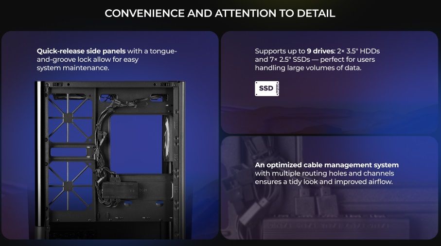 Black metal/tempered-glass midi-tower (vertical orientation) — supports Micro-ATX & Mini-ITX motherboards; includes 3 ARGB fans (2×120 mm top, 1×120 mm rear); supports liquid cooling (top: 120/140/240/280 mm, rear: 120 mm); front I/O with USB 2.0, USB 3.x, and audio on side panel; accommodates GPUs up to 340 mm, CPU coolers up to 160 mm; offers 7 × 2.5" and 2 × 3.5" drive bays, 4 expansion slots; dimensions 355 × 210 × 446 mm — sleek, compact & customizable.